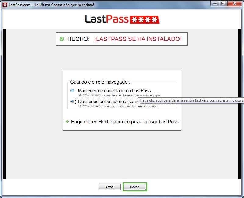 Se nos pide elegir entre mantener el programa conectado o cerrarlo, esto es por si el equipo en el que lo instalamos es compartido, por supuesto se recomienda cerrar siempre el programa: